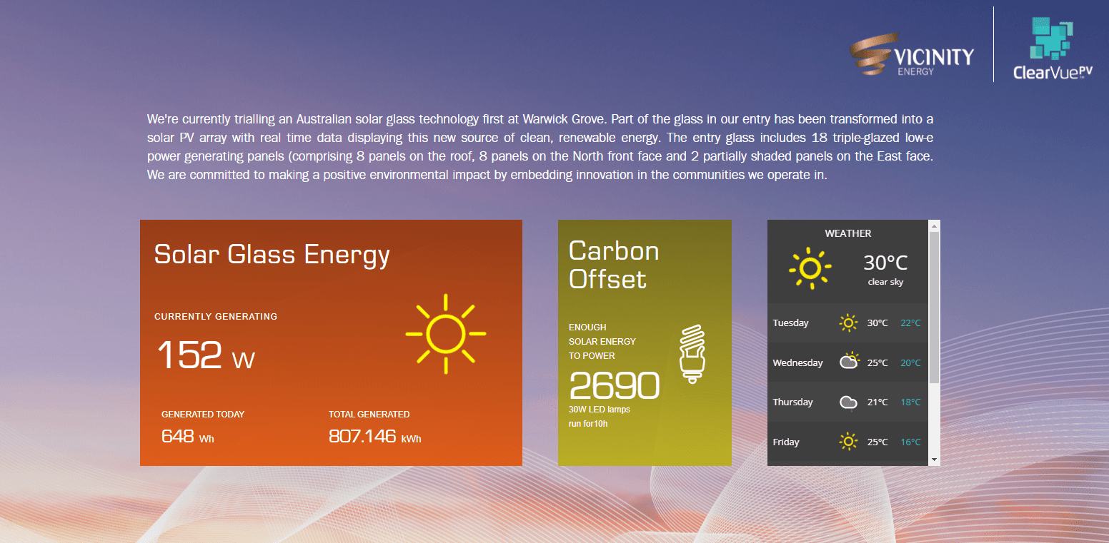 The Warwick Atrium was ClearVue’s first demonstration project, trialing the reliability and energy generation in a real-world context. The IGUs power the indoor lighting, outdoor signage and display screen of the shopping centre. Data is collected from the site on an ongoing basis allowing us to monitor the efficiency and power generation of the structure.
